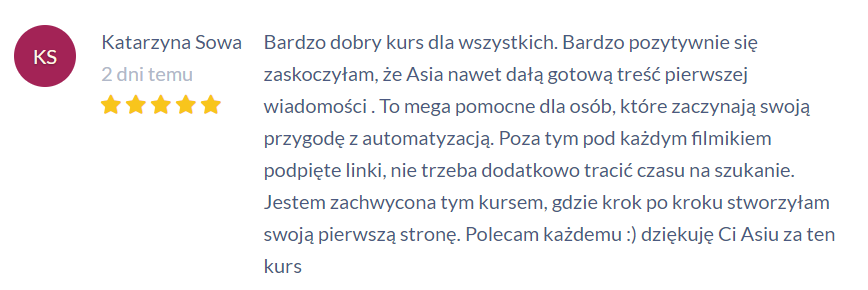 Serdecznie polecam współpracę z Asią wszystkim osobom, które potrzebują rozwiązań technicznych z ukierunkowaniem na swoje cele biznesowe, ale nie tylko. Asia jest osobą, która potrafi dzielić się wiedzą i ogromnym doświadczeniem w bardzo przystępny sposób językiem zrozumiałym dla każdego. Potrafi przekuć te pokłady wiedzy i doświadczenia w rozwiązania dla osób, które tego potrzebują, dając tym samym merytoryczne i mentalne wsparcie. Witryna, która zakupiłam u Asi to świetne rozwiązanie (Cztery w jednym, czyli sklep+platforma kursowa + blog + kreator stron). Zyskałam sporo czasu, który musiałabym poświęcić na budowanie sklepu, platformy kursowej, stron przechwytujących i innych stron lądowania oraz bloga. Witryna bardzo ułatwiła mi pracę i zarabianie przez Internet dlatego polecam innym osobą to rozwiązanie, jeśli myślą o zaistnieniu w Internecie i zarabianiu.